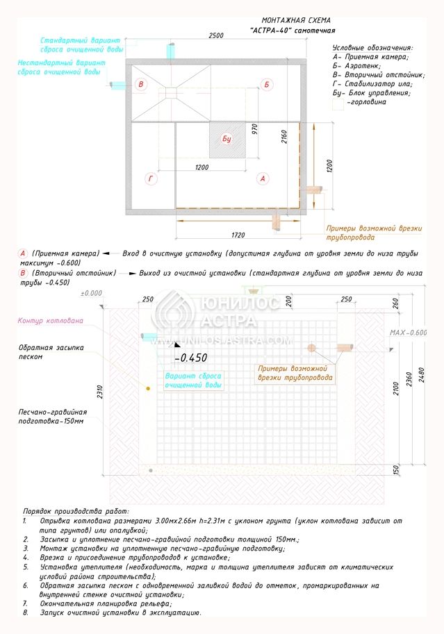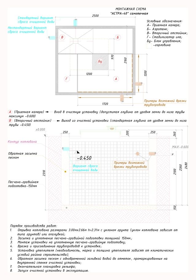 Септик Астра 40 рассчитан на проживании (временном или постоянном) в доме до 40 чел. Установка способна принять в качестве залпового сброса 15000 литров водных масс, а суточная норма установлена в пределах 3 кубометров. Септик может эффективно работать (при постоянном поступлении масс) при температуре внешней среды, достигающей -25°С.