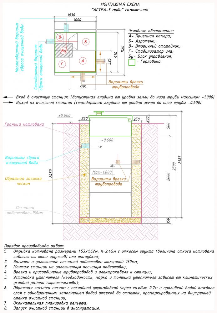 Если вы решили установить септик Астра 5 Миди самостоятельно, выполните работы в следующем порядке: